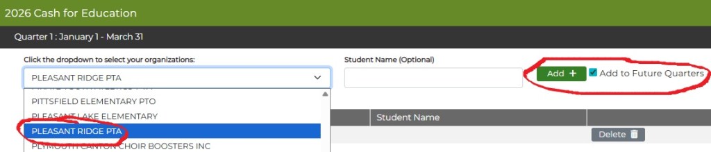 5. Scroll down to 2026 Cash for Education. Under the Quarter 1: January 1-March 31 section, find Pleasant Ridge PTA on the dropdown menu. Be sure to check the box for Add to Future Quarters, then click Add +.