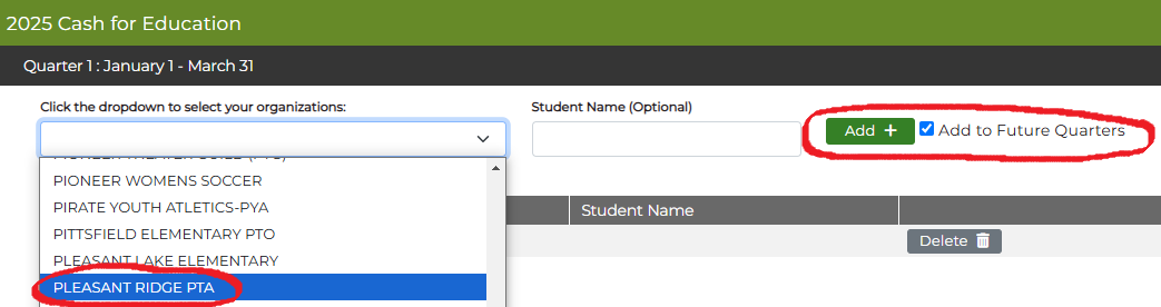 5. Scroll down to 2025 Cash for Education. Under the Quarter 1: January 1-March 31 section, find Pleasant Ridge PTA on the dropdown menu. Be sure to check the box for Add to Future Quarters, then click Add +.